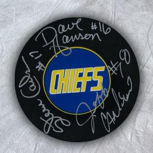 Hanson Brothers Triple SIGNED Charlestown Chiefs Puck...